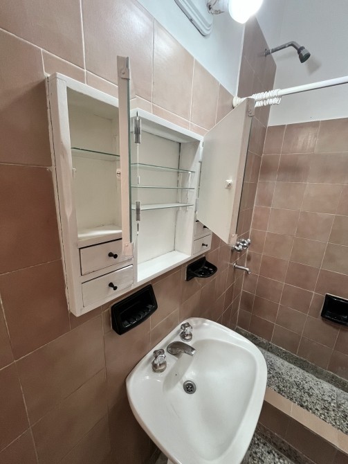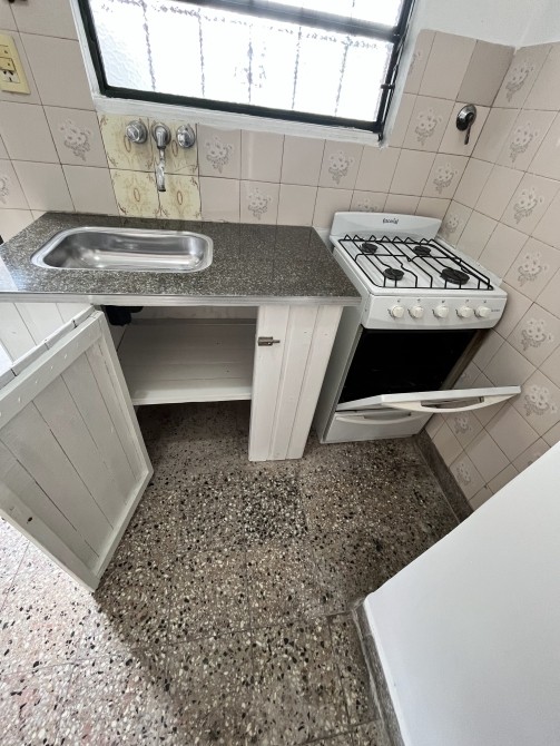 EL ESPACIO DE COCINA, CON APARATO DE COCINA, MESADA CON BACHA DE ACERO INOXIDABLE Y BAJO MESADA EN MADERA PINTADA.